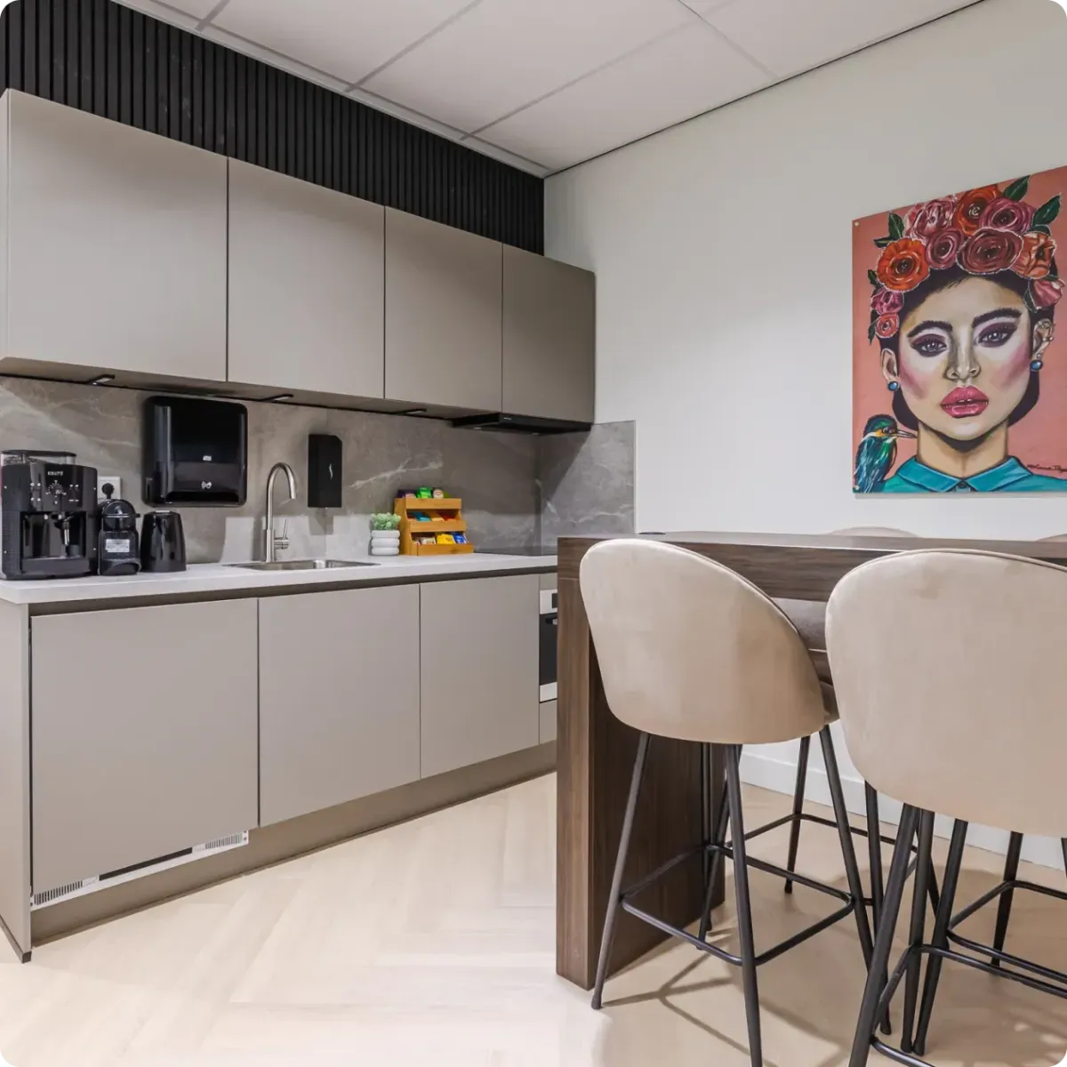 All-in huur inclusief: G/W/L, snelle wifi, schoonmaak van de algemene ruimtes, gebouwbeveiliging en digitale toegang, onderhoud en koffie/thee
